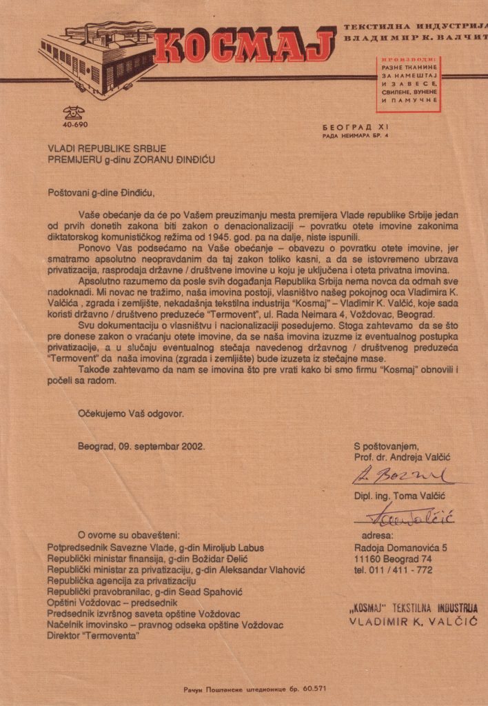 Kada je Zoran Đinđić postao premijer Srbije, imao je važnija posla. 2000. godine sam pristupio Ligi za vraćanje oduzete imovine i uključio se aktivno u borbu. Obraćali smo se svim nadležnim organima vlasti i tražili donošenje Zakona o vraćanju oduzete imovine, ali bez odgovora. Na jednom sastanku članova Lige sa premijerom Đinđićem, otvoreno smo ga pitali, kada se već udostojio da nas primi, kada misli da počne sa ispravljanjem te istorijske nepravde? Lakonski je odgovorio „Možemo da pričamo o čemu god hoćete, samo ne o vraćanju oduzete imovine.“ Pa dobro, pitao sam se zašto nas je uopšte i primio na sastanak? Znao je dobro ko smo i zbog čega smo došli. Nismo došli da pričamo o lakim ženama i teškim drogama, nego o rehabilitaciji naših pokojnih nepravedno osuđenih predaka, kao i o restituciji njihove imovine.